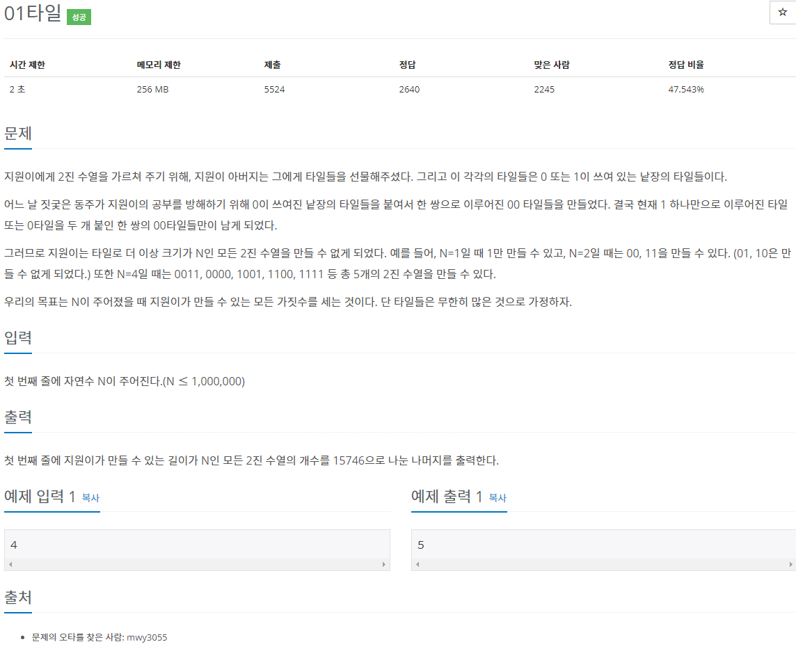 2. 1 ~ 100만까지의 피보나치 수열을 구한다. 각각의 값은 15746으로 나눈 나머지로 구한다.